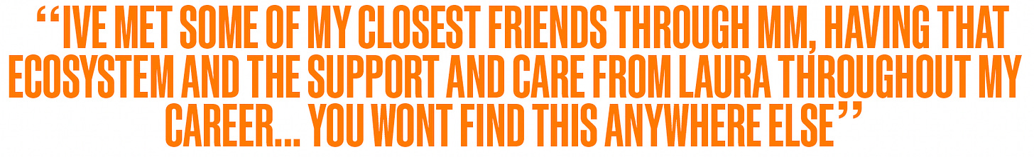 I was lucky enough to win the Mentoring Matters grant of £2000 in December 2023! That was really an incredible launch pad for my business. I didn’t use it for anything extravagant like a launch party or marketing etc, it simply helped keep the business alive in its early days while I was still figuring out how to make money. I was obviously also a part of the mentoring scheme (first cohort represent) and that experience taught me literally everything I know about journalism. I’ve met some of my closest friends through MM, having that ecosystem and the support and care from Laura throughout my career... you won’t find this anywhere else. THANK YOU MM.
